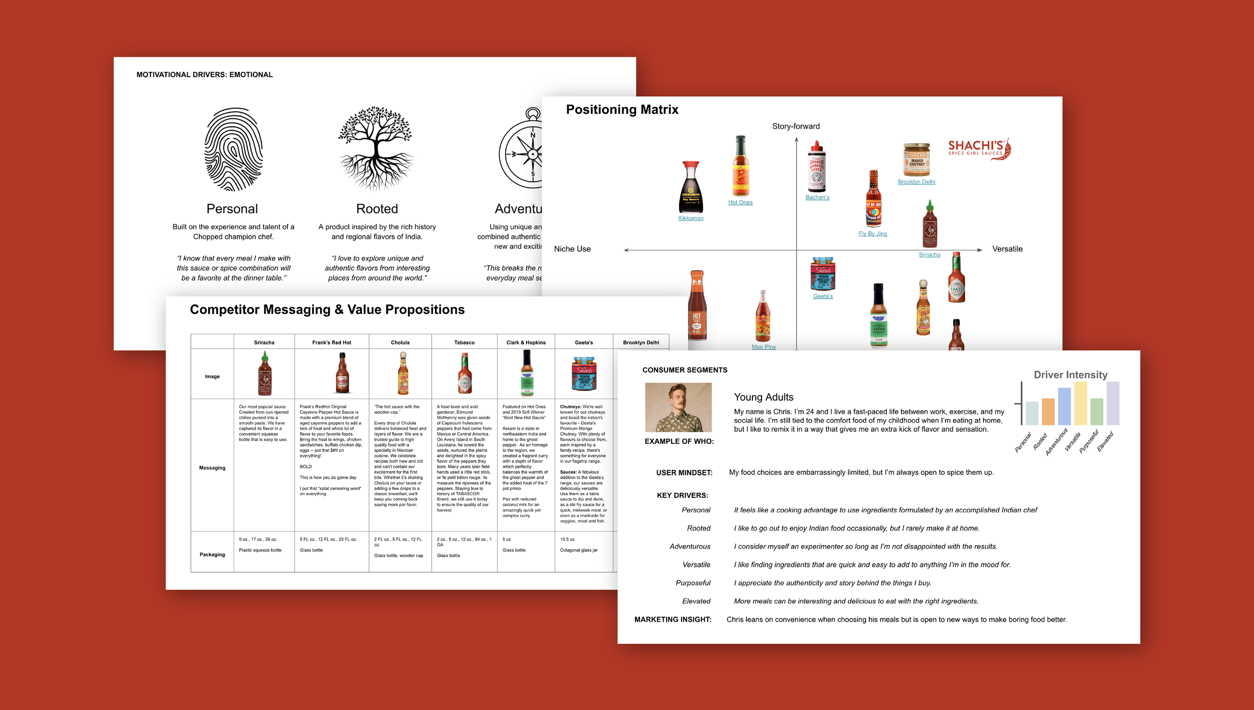 We began with a comprehensive brand foundation process, conducting positioning research to understand the competitive landscape and identify the white space where Shachi's could authentically own a distinctive place in the market. From there, we defined the brand's core constituent segments, mapping who the sauces speak to and why. We also developed a vocabulary framework that established the language, tone, and personality to carry through every brand touchpoint. That research and discovery culminated in a unifying brand idea that captures the spirit of the line: a celebration of Indian heritage made approachable and craveable for a wide range of palates, anchored by the balance and intentionality Shachi learned from the late Chef Floyd Cardoz.